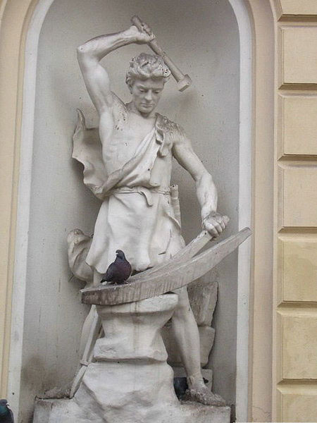 Хельсинки, здание на площади перед Стокманном. Слева аналогичная скульптура кузнеца, и на обеих из них постоянно прячутся голуби.