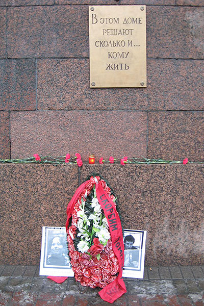 У стен Управления ФСБ на Литейном проспекте проведена необычная акция памяти погибших. На стене здания появилась мемориальная доска с надписью "В этом доме решают, сколько и кому жить".