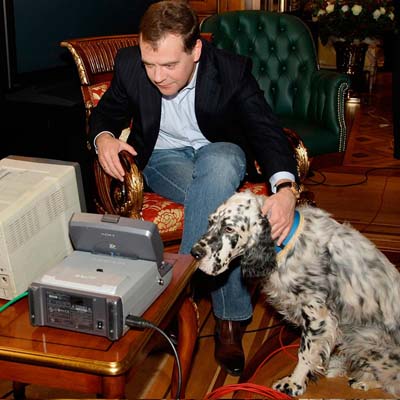 Президент Дмитрий Медведев у себя в резиденции Горки-9 замечен в обществе неопознанной собаки. Памятую о роли лабрадорши Кони в российской политической жизни, народ озадачен - кто это?