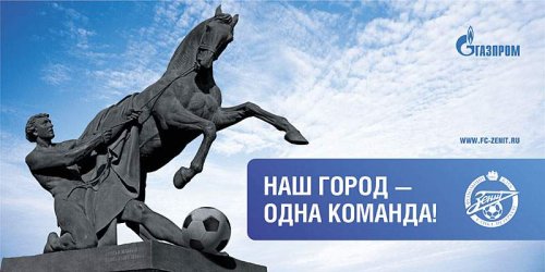 В начале мая на улицах Петербурга появились новые плакаты рекламной кампании футбольного клуба «Зенит». Кони Клодта играют в футбол, ограды Летнего сада увенчаны кубками.