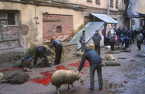 Ужасающую картину можно было наблюдать в самом центре Петербурга. Люди шли по Апраксиному двору и между 34-м и 36-м корпусами увидели страшную картину: несколько десятков лиц "кавказской национальности" тащили блеющих баранов. Тут же на асфальте, разложили картонки и начали их резать. Кровь хлестала во все стороны, отрезанные головы падали им под ноги.