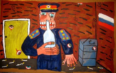 На картинах, представленных на выставке "Волшебная психоделическая милиция", в гротескной форме изображены милиционеры, занятые абсурдными или бесполезными вещами. К примеру, на одной картине милиционер рубит топором тараканов, на другой - играет в PSP, на третьей - запускает бумажный самолетик из листка Конституции и так далее.
