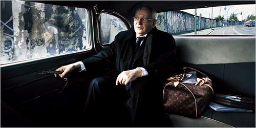 На опубликованном принте Михаил Сергеевич изображен на заднем сидении дорогого автомобиля. Рядом с ним - приоткрытая дорожная сумка Louis Vuitton. Политик задумчиво смотрит в окно, пейзаж за котороым оставляет весьма тягостное впечатление. Как заметил журналист New York Times, выражение лица Горбачева такое, будто в сумке он перевозит полоний-210.
