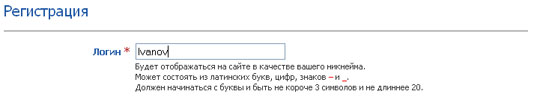 После того как вы придумаете себе логин, который будет отображаться на сайте в качестве вашего никнейма (может состоять из латинских букв, цифр, знаков – и _,должен начинаться с буквы и быть не короче 3 символов и не длиннее 20):