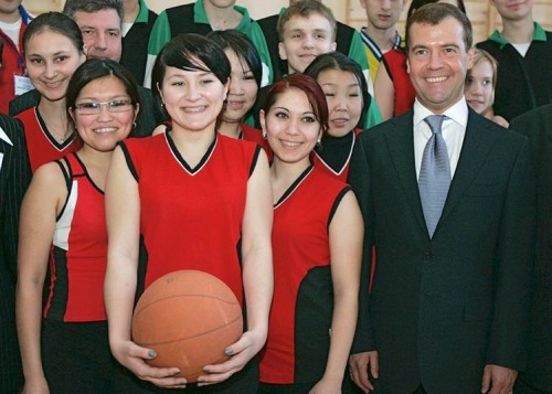 Якутия: Групповой портрет студенческой спортивной команды индустриального техникума поселка Светлый с преемником Дмитрием Медведевым. Ельцин — 189 см, Путин — 170 см, Медведев — 158 см, баскетболистки – ? см.