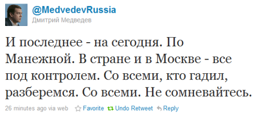 Президент Дмитрий Медведев в своем микроблоге на Twitter оставил запись, посвященную событиям на Манежной площади, где в субботу днем агрессивная толпа вступила в противостояние с милицией и нападала на прохожих.