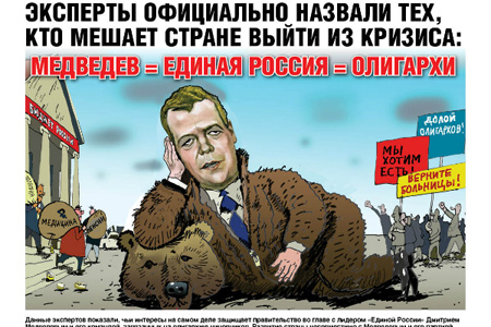 На первой странице агитационной газеты над изображением человека в медвежьей шкуре был написан лозунг «Медведев = Единая Россия = Олигархи». В связи с этим избирком Магадана запретил использование карикатур на премьера Медведева в агитационной газете «Справедливой России».