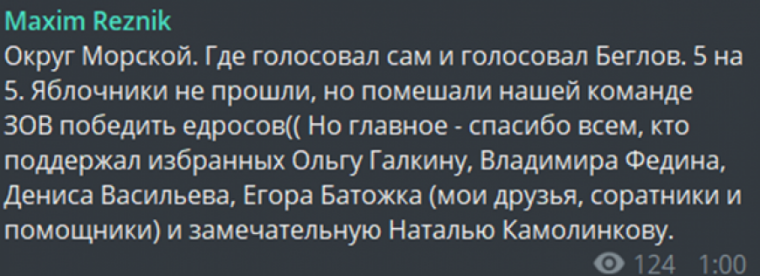 «Умное голосование» скандального блогера Алексея Навального потерпело полное поражение не только в Москве, но и в Петербурге. Вопреки всем ожиданиям «оппозиции», победу на губернаторских выборах одержал Александр Беглов с результатом 65,64% голосов. Прошло уже больше суток после завершения выборов-2019 в Петербурге. Подсчитано более 95% голосов. И уже сейчас можно смело заявить: система «Умного голосования» Навального окончательно провалилась. Блогеру так и не удалось стать авторитетом в глазах демократов, несмотря на поддержку его сторонников. Одним из ярых защитников проекта был печально известный депутат петербургского ЗакСа Максим Резник. Не покладая рук, он день и ночь писал огромные посты на своей страничке в социальной сети, освещая почти каждый шаг своего кумира. Однако, чем дальше, тем больше такие оды вызывали раздражение. На самом деле смешно наблюдать, как человек, подставивший свою партию из-за участия в фальсификации голосов избирателей, рассуждает на тему честных и нечестных выборов. Смешнее разве что, когда петербуржец, депутат и действующий политик со стажем ради обещанного «прекрасного будущего» становится рупором блогера с сомнительной репутацией. Не унимался Резник и в ночь выборов. В одной из своих публикаций он обвинил кандидатов «яблочников» в том, что они нагло мешают «его» команде. ![]() Однако лидер петербургского «Яблока» и по совместительству близкий друг депутата-травокура Борис Вишневский сильно раскритиковал и бессмысленные «рассказы» товарища, и само «Умное голосование» Навального. Ведь голосовать по этой схеме – значит, устроить хаос, а действовать по чужой указке в принципе антидемократично. Помимо прочего, Резник уж очень гордился придуманным лозунгом «За любого, кроме Беглова!», который популяризировали городские оппозиционеры. Правда, стоит отметить, что его кумир Навальный не очень-то участвовал в травле врио губернатора. Он был слишком занят выборами в Мосгордуму, а затем и незаконными акциями, с помощью которых пытался отбить вложенные в несостоявшихся кандидатов деньги. Но в то время, как одни красиво рассуждали о том, кто достоин, а кто не достоин Петербурга, другие просто работали. Так, самовыдвиженец Александр Беглов приложил все усилия, чтобы завоевать доверие горожан. Ему пришлось разбираться со многими накопленными предыдущим губернатором проблемами. Но время шло, и все менялось к лучшему. По его указанию достроили и открыли несколько школ, привели в порядок проспекты, погасили конфликт с метростроевцами, запустив в тестовом режиме три новые станции фиолетовой ветки. Вопреки всем чаяниям оппозиции, настойчиво убеждавшей город, что ему нужен кто угодно, кроме Беглова, жители практически единогласно поддержали самого надежного кандидата. Да, в Петербурге еще остались нерешенные проблемы. Новому губернатору предстоит очень много работы на своем посту. Но есть основания полагать, что он не подведет доверивших ему любимый город избирателей.