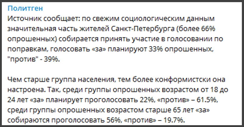 До общероссийского голосования за поправки в Конституцию осталось менее двух недель. В связи с этим многие СМИ и блогеры начали проводить соцопросы, пытаясь таким образом предугадать результаты голосования. Так как агитация за принятие поправок и против них не предусмотрена, то некоторые политические силы пытаются использовать статистику весьма сомнительного качества для манипулирования общественным мнением. Как правило, результаты таких опросов сильно разнятся с показателями крупных исследований. Например, политический эксперт Ярослав Игнатовский в своем Telegram-канале «Политген» написал, что из 66% петербуржцев, которые намерены принять участие в голосовании, лишь 33% готовы отдать свой голос за обновление Конституции. Примечательно, что он сослался на некий анонимный источник. Как следствие, остальные тематические каналы и группы в социальных сетях подхватили этот вброс, выставляя его в качестве аргумента о непопулярности поправок в Конституцию среди граждан. ![]() Необходимо подчеркнуть, что всероссийское исследование, проведенное специалистами ВЦИОМ, показало, что 66% граждан намерены принять участие в голосовании. Эта цифра совпадает с информацией анонимного источника Игнатовского, однако поддержать поправки хотят не 33%, а 61% от общего числа респондентов. Кроме того, источник из Администрации президента сообщил «Коммерсанту», что явка ожидается на уровне майского прогноза ВЦИОМ. Политтехнолог Сергей Григорьев прокомментировал статистику Игнатовского. Он отметил, что последний не имеет стабильного заработка и, похоже, ищет работу, заявляя с помощью резонансного вброса о себе. Также он напомнил, что Игнатовский и раньше использовал неподтвержденные данные. Со слов эксперта, материал получался весьма некачественным. Именно поэтому его уволили с предыдущего места работы. По мнению Григорьева, с помощью вброса о статистике в Петербурге автор ТГ-канала «Политген» попытался привлечь к себе внимание потенциальных работодателей. «Насколько я знаю, Игнатовский пару лет находится без работы после того, как его уволила пригожинская группа политтехнологов. И уволили его как раз потому, что он представлял некачественный материалы и грешил высосанной из пальца информацией», - рассказал Григорьев. Политолог твердо убежден, что в реальности поправки поддерживают куда больше граждан, чем утверждает Ярослав Игнатовский. Эксперт подытожил, что так называемая инсайдерская информация является не более, чем попыткой безработного политолога бесплатно прорекламировать себя.