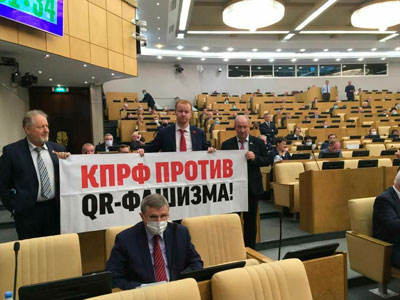 Депутаты Госдумы от КПРФ во время рассмотрения в первом чтении законопроекта о введении QR-кодов в общественных местах устроили протестную акцию, развернув плакат «КПРФ против QR-фашизма».