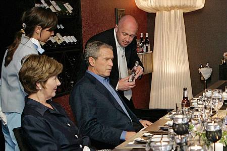 На снимке Буш вместе с супругой Лаурой ужинает с Владимиром Путиным, которого также сопровождает его тогдашняя жена Людмила.