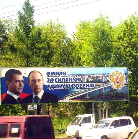 Плакат с надписью "Омичи за сильную единую Россию" и фотографией Путина появился в Омске на улице Красный Путь в 2000 году - сразу после избрания политика президентом страны. Позднее, когда главой страны был избран Медведев, фото нового президента появилось рядом с изображением Путина.