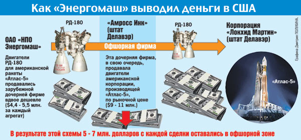 «Американцы жируют. А российские заводы на ладан дышат» Из материалов проверок Счетной палаты «...ОАО «НПО Энергомаш» является ведущим отечественным разработчиком мощных жидкостных ракетных двигателей практически для всех отечественных ракет-носителей, с помощью которых выполняются пилотируемые полеты, а также выводятся на орбиту спутники, обеспечивающие связь, навигацию, телевещание... Осуществляет серийное изготовление двигателей РД-180 для первых ступеней американской ракеты-носителя «Атлас-5»... Передаваемая компаниям США через компании, зарегистрированные в офшорной зоне США, продукция и результаты научно-технической деятельности были недооценены. В последние годы продажа ракетных двигателей РД-180 в США осуществлялась по ценам ниже себестоимости. Только в 2008-2009 годах убыток от продаж по таким ценам составил около 880 млн. рублей. (Почти 68 % всех убытков ОАО «НПО Энергомаш» в тот период.)» - Сергей Вадимович, и к чему это все привело? - А к тому, что основной объем прибыли, по сути причитающийся «Энергомашу», оседал на счетах компаний, зарегистрированных в офшорной зоне США. - То-то американцы обрадовались! А «Энергомаш»? - Он оказался в предбанкротном состоянии. Резко ухудшилось его финансовое положение. Отсюда и главные проблемы - техническое перевооружение на предприятии притормозилось, реконструкции и капитальному ремонту оборудования, и вообще основных фондов, нужного внимания не уделялось. Как, впрочем, и работе с кадрами. - То есть, компании в США жировали, а «Энергомаш» дышал на ладан? - Вот именно. - А мы-то думаем - почему у нас спутники падают... - Да, в том числе и потому, что одно из крупнейших предприятий космической отрасли - «Энергомаш» - оказалось в бедственном положении.