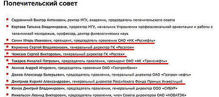С Сечиным все понятно. А попечители Чемезов и Токарев во время службы в КГБ жили в одном подъезде с семьей Путиных в Дрездене, где Катерина и родилась. Материальная поддержка госкомпаний, возглавляемых попечителями дочери Путина не ограничивается попечительскими взносами. Фонд "Национальное интеллектуальное развитие" за последние 2 года выиграл у этих компаний конкурсов на почти 100 млн. рублей. Очевидной коррупции с этими конкурсами не обнаружено. К одному конкурсу (Роснефти на 46 млн) Путину-Тихонову даже не допустили, что с лихвой, правда, компенсировано упомянутым выше обещанием 530 млн на 17 проектов до 2017 года. В ксомнительном онкурсе участвовало два претендента: фонд "Национальное интеллектуальное развитие" Катерины с ценником 40 миллионов и ООО "Спецмеханика" из Кирова, предлагающая сделать работу на 10 миллионов меньше. Кто выигрывает? Конечно, фонд "Национальное интеллектуальное развитие". Организаторы конкурса объясняют это тем, что у кировской компании не было "принципиального соглашения с МГУ": Формально это абсолютно дискриминационное требование и зачем вообще проводить конкурс, если выиграть его может только мгу-шная структура. По идее, некоммерческий фонд с таким бюджетом должен быть довольно хорошо известен, хотя мы все узнали о нём из единственной публикации в РБК.