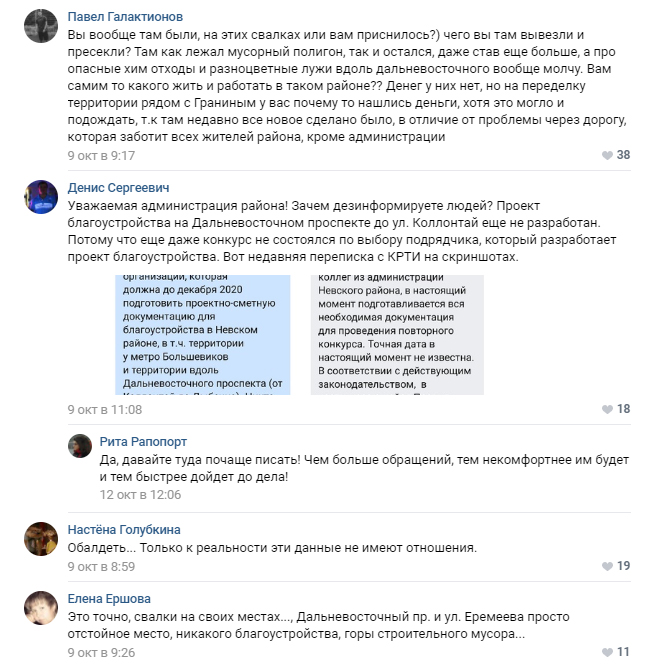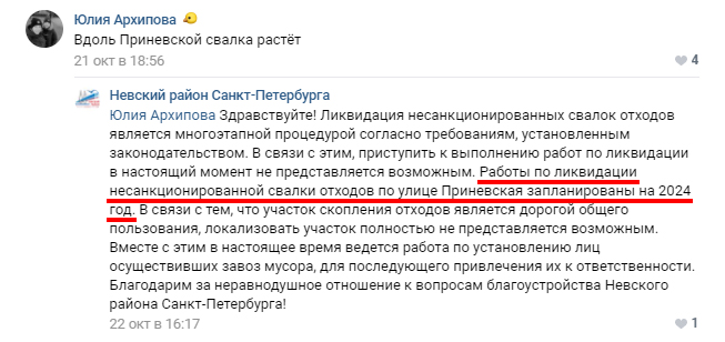 Администрация Невского района отчитывается о проделанных работах в рамках процесса ликвидации несанкционированных свалок, но при этом, отвечая на замечания о разрастающихся скоплениях мусора, не может указать точные сроки завершения всех мероприятий, чем вводит местных жителей в заблуждение. Власти Невского района продолжают публиковать на официальной странице администрации в социальной сети информацию о результатах продолжающейся борьбы с незаконными свалками. Так, 24 октября стало известно о вывозе с Приневской улицы 15 контейнеров с отходами, что составляет более 400 кубометров мусора. При этом в публикации уточняется, что «все несанкционированные свалки на территории района включены в программу ликвидации свалок на 2021 год». ![]() ![]() Однако местные жители обращают внимание на несоответствие этого обещания с ранее опубликованными ответами администрации на жалобы горожан. ![]() Пользователь совершенно справедливо указывает на расхождение в датах, ссылаясь на комментарии к посту от 21 октября, в котором также утверждается, что Невский район будет избавлен от незаконных свалок в 2021 году. Но, отвечая на замечание одной из местных жительниц относительно растущей свалки вдоль все той же Приневской, администрация заявляет, что работы на этой улице запланированы на 2024 год. ![]() Люди также не верят публикуемым администрацией данным о якобы пресечении несанкционированного складирования строительных и бытовых отходов на участках Дальневосточного проспекта и ликвидации нескольких незаконных свалок в районе Октябрьской набережной, на улице Ольги Берггольц и Заводской. По мнению жителей района, местные власти тратят время и бюджетные средства не на решение актуальных проблем, которые беспокоят население, а на проекты, не требующие оперативного реагирования и принятия срочных мер. ![]() Таким образом, можно предположить, что представители Администрация Невского района либо намеренно дезинформируют жителей через соцсети в попытке уйти от неудобных вопросов, либо сами запутались в своих неправдоподобных обещаниях. Стоит отметить, что серьезные проблемы с несанкционированными свалками в Невском районе наблюдаются уже не первый год. В частности, администрация под управлением Алексея Гульчука отказывается решать проблему с рекультивацией золоотвала на пересечении Зольной улицы и Дальневосточного проспекта.