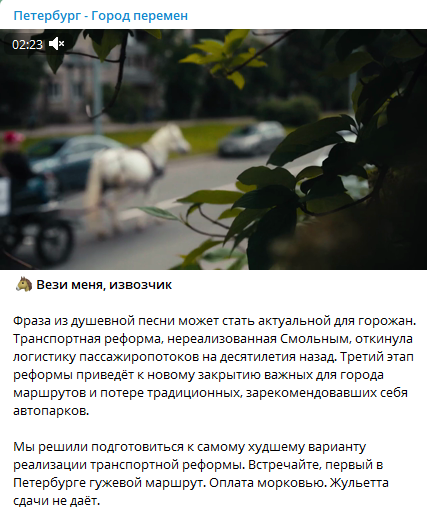 В итоге большинство горожан полностью разочарованы в НМТО Смольного. На фоне этих проблем активисты «Города перемен» обратились к историческому опыту городского извоза столетней давности и вместе с кобылой Жульеттой вышли на маршрут.