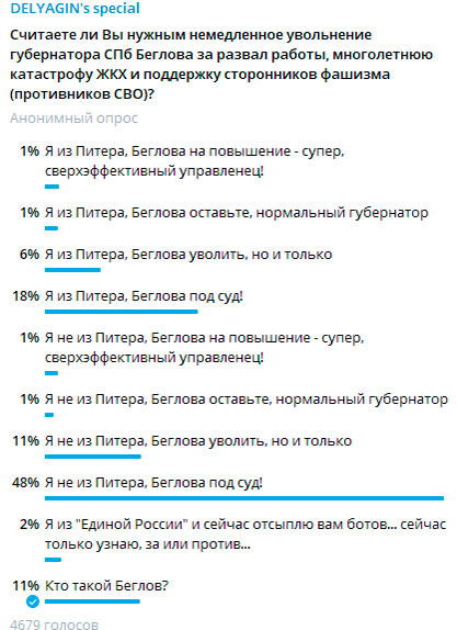 граждан из других субъектов РФ считают, что Беглов заслуживает увольнения и