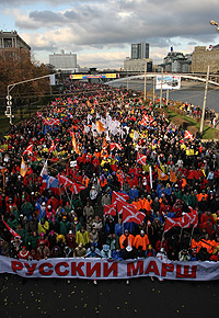 "Наши" очистили День народного единства от свастик и фашистских приветствий. В Москве молодежной движение «Наши» провело свою версию «Русского марша». До недавних пор это ежегодное мероприятие носило откровенно националистический оттенок, а потому вызывало множество протестов со стороны общественности. В этот раз марш прошел по совершенно иному сценарию и с совершенно другой идеей – «русские позвали к себе все остальные народы». Или, как заявила один из организаторов акции, Мария Кислицына – «Русский марш – все свои».