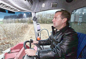 Возможно, не стоит придираться, а лучше порадоваться, что семья премьера, пусть даже из бизнес-интересов, решила заняться развитием сельского хозяйства? Однако, уже собственный рекламный ролик «Мансурово» наводит на размышления. Почему-то успехи предприятия расхваливают (1.19-1.53) прежде всего приближенные к проекту германские коммерсанты: хозяин фирмы Аmandus Кahl, известной в качестве поставщика оборудования для подготовки, кондиционирования и гранулирования продуктов, Йоахим Берман, владелец компании Riela, выпускающей оборудование для хранения и сушки зерна, Карл-Хайнц Кноп и Клаус Драйер из продающей сельсхозтехнику Amazone. О том же говорится и в «Крестьянской программе» телеканала ТВЦ за 9 сентября 2012 года. Ведущий, работники «Мансурово» и лично госпожа Харитонова взахлёб описывают (1.15 — 6.40) преимущества немецких зерноуборочных машин компании Claas и вступления России во Всемирную Торговую организацию, позволяющее им закупать германскую технику и навсегда отказаться от российских комбайнов. Логично предположить, что лидер государства должен стремиться к тому, чтобы развивать производство сельхозтехники прежде всего в собственной стране. Сейчас же получается, что Медведев пролоббировал вступление России в ВТО даже ценой уничтожения российского машиностроения только потому, что его личному бизнесу это выгодно. Не менее примечателен и следующий сюжет программы (6.46 — 8.13). Один из самых доверенных соратников Медведева вице-премьер Аркадий Дворкович разъясняет, что цены на хлеб будут расти, но ограничивать экспорт зерна ради этого правительство не собирается. Знакомые слова. В последние десятилетия существования Российской Империи их произнёс министр финансов Иван Вышнеградский, который накануне надвигающегося голода пренебрежительно бросил «Не будем есть, но будем вывозить!» Впоследствии точно также вели себя и большевики, включая деда премьер-министра – председателя мансуровского колхоза Афанасия Федоровича Медведева. Под его руководством, по воспоминаниям односельчан, «мёрли люди, как снопы». Вышнеградского и большевиков (но не снятого с председателей и удравшего от гибнущих от голода земляков в Краснодарский край Афанасия Медведева) отчасти извиняет то, что деньги от экспорта зерна они направляли на индустриализацию России, а не растаскивали по карманам. Здесь же мы наблюдаем циничный лоббизм зарубежного производителя, сознательный курс на превращение страны в сырьевой придаток и бессовестный захват государственных земель тёплой компанией родственников, однокурсников и учеников господина Медведева во главе с ним самим.