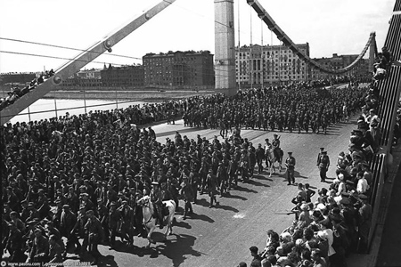 Москва 17 июля 1944 года. Пленные были собраны на московском ипподроме и стадионе «Динамо». Накануне символического марша всех пленных хорошо накормили. К 11 часам утра 17 июля их разделили на две группы и построили в соответствии со званием по 600 человек (20 человек по фронту). Руководил прохождением колонн командующий войсками МВО генерал-полковник П. А. Артемьев. "Ночь накануне эти колонны плененных под Сталинградом немцев провели на ипподроме. С той стороны, от зоопарка, их и выводили на Садовое кольцо в сторону Москвы-реки. Впереди шел генерал. Он шел совершенно один, впереди всех, строгий, прямой, подтянутый, в очках, с каменным лицом. И ни кого вокруг не видел. Шел с большим достоинством, как будто вел не тех огородных чучел, в которые были наряжены его солдаты, а настоящее войско. За ним по несколько человек в ряд шли офицеры. Они с большим любопытством (именно с любопытством) оглядывали все вокруг, город, людей. Дальше шли солдаты. Это было просто ужасно. Худые, оборванные, наряженные в то, что они отнимали у русских, погибая от холода, хотя и было лето: клетчатые бабьи платки, телогрейки, огромные эрзац-валенки. Очень высокие, сплетенные из соломы, с огромными ступнями, просто чудовищно огромные. Их надевали поверх своих сапог. Шли они в таких эрзацах, как паралитики. Даже не шли, а еле ползли. Многие были замотаны какими-то тряпками. И вот такое войско вел человек с каменным лицом. Народ вокруг молчал. Более того — стояла звенящая тишина. Никаких выкриков. Было такое ощущение, что и зрители оцепенели от ужаса. Мимо них шли несчастные люди — тоскливые, безразличные ко всему, отрешенные...".