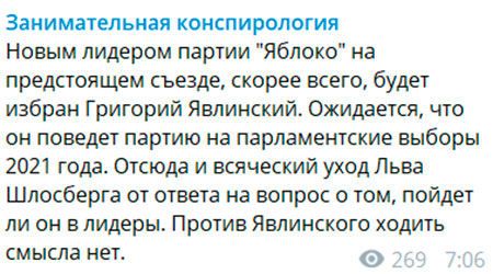 Петербургское отделение «Яблока» провело тайное собрание в преддверии декабрьского общефедерального съезда партии, на котором будут выбирать нового главу политобъединения. На встрече в Петербурге Борис Вишневский выступил против Григория Явлинского и заявил о своей «непотопляемости». Депутат ЗакСа уверен, что его никто не выгонит из «Яблока» и не лишит депутатского мандата в Заксобрании Петербурга, несмотря на любые скандалы. Выборы в «Яблоке» Партия «Яблоко» 13-15 декабря проведет всеобщий съезд для подведения итогов выборных кампаний за последние четыре года. На мероприятии переизберут руководство политического объединения, а также выберут нового лидера партии. По информации СМИ, в конкурентную борьбу вступят: нынешний председатель Эмилия Слабунова, зампред партии Николай Рыбаков и глава псковского отделения Лев Шлосберг. Перед общим собранием будет проведена конференция московского отделения, уже полгода существующая без лидера. Эксперты, политики и СМИ предполагают, что съезд «Яблока» принесет немало сюрпризов, в том числе по кандидатам, выдвигающимся на лидерскую позицию в партии. Telegram-каналы не исключают, что побороться за пост председателя может и Григорий Явлинский. Об этом пишет канал «Занимательная конспирология». По мнению авторов, именно он поведет партию на выборы в Государственную думу в 2021 году. ![]() В преддверии декабрьского съезда петербургское отделение «Яблока» 18 ноября провело собственное собрание, на котором обсуждалась предстоящая ротация руководства, а также текущие политические проблемы и планы. Информация о мероприятии нигде не анонсировалась, а потому встречу можно считать неофициальной и тайной. «Яблочный сговор» Источник нашего издания в партии раскрыл некоторые подробности встречи, а также рассказал о готовящемся сговоре «яблочников» Петербурга против некоторых кандидатов на пост главы партии. «Тайное собрание прошло в петербургском штабе Яблока. Предстоящий съезд в середине декабря актуализировал внутренние проблемы партии. Однопартийцы начали проводить агитационные кампании против кандидатов на пост председателя «Яблока». Петербург не стал исключением. Много разговоров было по поводу возможного выдвижения Явлинского. С учетом этого факта, на выборах руководства будет борьба. Петербургское отделение готовит сговор – они будут выдвигать Шлосберга. Явлинского не поддержат», - рассказал собеседник издания. По словам источника, на неанонсированном собрании присутствовал и депутат ЗакСа Борис Вишневский, который вел себя через чур уверенно, учитывая то положение, в котором он сегодня оказался. «Описываемый в СМИ скандал с домогательствами к студенткам в Герцена ударил по репутации партии. Кто-то не поверил, что профессор на такое способен. Но были и те, кто вполне допустил вероятность подобных событий. Но важно то, как ведет себя сам Вишневский. Он считает себя неприкасаемым, непотопляемым и на собрании прямо заявил, что ему плевать на Явлинского и на то, будет ли он главой «Яблока» или нет. Вишневский считает, что он не потеряет свою должность руководителя фракции «Яблока» в Заксобрании, депутатский мандат, и никто его не выгонит из партии, чтобы ни произошло. Все дело в поддержке Вишневского Шлосбергом в скандале с домогательствами. У них сложился взаимовыгодный тандем 