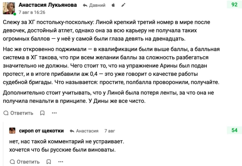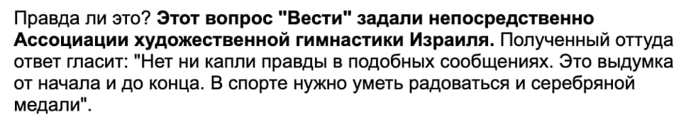 Наконец-то! Нашли главных виновников в неудаче на Олимпиаде наших гимнасток: Алишер Усманов и его жена Ирина Винер, главный тренер сборной России. На Конте вышло целое разоблачение, вывели вредителей на чистую воду. Никому не скрыться от бдительного ока наших виртуальных патриотов. Поскольку я здесь периодически выступаю адвокатом буржуев и даже не раз упоминал Усманова, рассказывая как он в числе прочих вкладывает в Россию миллиарды, не смог пройти мимо. Итак, в чем суть обвинений. По пунктам: 1. "Ирина Винер, вместе с со своим... супругом - Алишером Усмановым, является главным спонсором федерации художественной гимнастики Израиля. Именно благодаря Винер эта дисциплина в Израиле так поднялась за последние 10 лет... У госпожи И. Винер-Усмановой нет желания объяснить такое странное совпадение? Как вышло, что израильтянка, потеряв ленту, выиграла у россиянки, сделавшей более сложную программу и не допустившей ни единой ошибки?" Согласитесь, схема даже чем-то красивая в своей абсурдности: 10 лет назад Винер начинает развивать гимнастику в Израиле, чтобы в один прекрасный момент забрать золото у российских спортсменок. А вот реальность. Информацию про Винер-Усманова, которые потратили годы и миллионы на наших конкурентов, запустил в массы произраильский телеграм-канал, а затем ее тут же продублировал известный патриот Мардан. После чего эта инфа разошлась уже везде. Очень похоже на классический проплаченный вброс, но не будем. Важно то, что эта информация никем и нигде не подтверждается. Более того, сами же израильтяне ее опровергают: ![]() То есть обвинение строится на откровенной лжи? Ну да. А что такого? Обычное дело для нашего псевдопатриотического дискурса. Идем дальше. 2. Две цитаты из двух абзацев, которые следуют один за другим: "Не хочет ли она [Винер] заявить протест судейской бригаде и потребовать поменять местами на пьедестале россиянку и израильтянку?" "При этом главного тренера сборной России нет на Олимпиаде в Токио. Это как? Говорят - врачи запретили после коронавируса..." Это очень сильно. Тренера обвиняют в том, что она лично не заявила протест, хотя знают, что ее там физически не было. Протест, естественно, подали, для этого личное присутствие Винер не обязательно, но сам подход у обвинителей, согласитесь, мощный. Хочется попросить телефон дилера. И последний пункт. 3. "Ещё говорят: это Британия организовала, чтобы Россия не победила её в медальном зачёте. Возможно и даже очень. Но вот незадача - а какой страны гражданин муж Ирины Винер?" Бинго! Если поначалу я ждал, что Усманова и Винер обвинят в работе на Моссад, то здесь стало понятно, что одной иностранной разведки будет маловато. Ми-6 для полного комплекта - самое то. "Сколько у нас ещё таких во власти, защищённых от нехороших подозрений? У вас есть вопросы, как они себя поведут в случае войны?" Не знаю, о какой власти речь, Усманов не чиновник и никогда им не был. О какой войне бредят наши патриотические рыцари клавиатуры (кстати, а как они себя поведут?), тоже непонятно. Но вот насчет якобы британского паспорта Усманова хочется задать тот же вопрос, что и по теме "спонсорства" сборной Израиля: а пруфы будут? Отвечу сам: нет, не будут. Потому что пруфов нет. Характерная черта патриотических обвинителей в адрес "властей" и "олигархов" - сыпать вот такими обвинениями, ни в малейшей степени не у