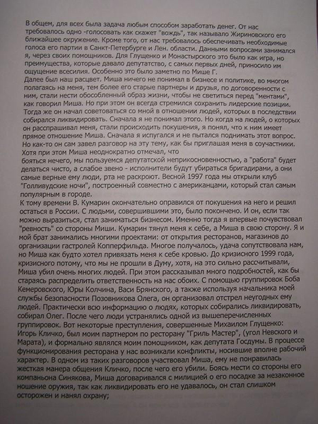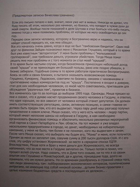 Меньше, чем через сутки после задержания Михаила Глущенко, а затем заявления СКП о его причастности к убийству Вячеслава Шевченко, в интернете появился документ "предсмертная записка", который, якобы, принадлежит перу Шевченко, и в котором он выражает обеспокоенность за свою жизнь. И связывает это беспокойство с именем Михаила Глущенко, а также обвиняет его в ряде кромких заказных убийств в Петербурге.