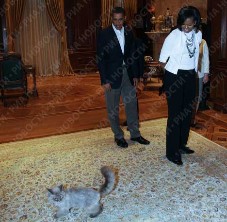 Первый день визита в Россию для главы США Барака Обама и его супруги Мишель закончился знакомством с "хозяином" подмосковной резиденции российского президента "Горки" Дорофеем - красавцем-котом с выразительными голубыми глазами, редкого для породы "невская маскарадная" окраса blue-tabby-point (светло-серый, с темно-серой маской, полосками и такими же темными лапками и кончиком хвоста).