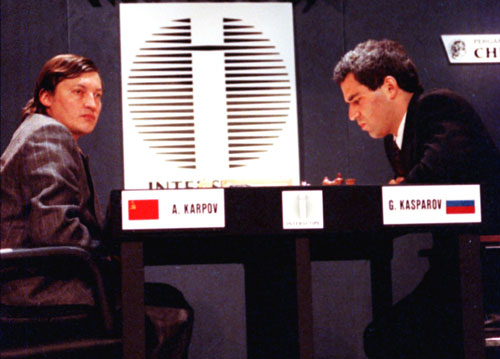 1990–й год: Гарри Каспаров впервые выступил на чемпионате мира не под советским, а под российским флагом; Карпов выступал под флагом СССР.