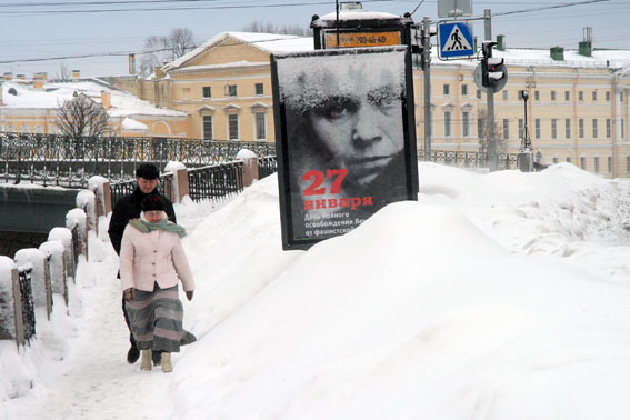 Настоящие блокадные условия создали в Петербурге возле рекламных щитов с социальной рекламой, посвященной Дню полного освобождения Ленинграда от блокады. На площади Белинского у цирка плакат оказался в глубоком сугробе.