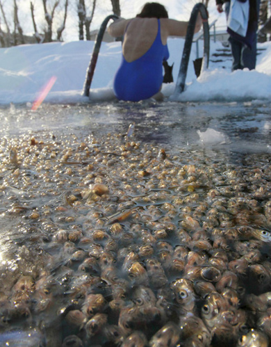 Зимой в искусственных городских прудах под толщей льда из-за небольшого количества воды происходят застойные явления. Особенно в это время страдают мелкие виды рыб в загрязненных водоемах, где образуются анаэробные (безвоздушные) условия, может выделяться газ метан, а также в неглубоких прудах, промерзающих почти до дна. Следствием недостатка кислорода становится замор рыбы. Если сильные морозы продлятся еще несколько дней, а прорубь окончательно замерзнет, то рыба в этом пруде по-видимому обречена на вымирание.