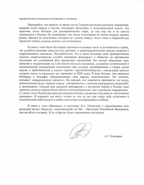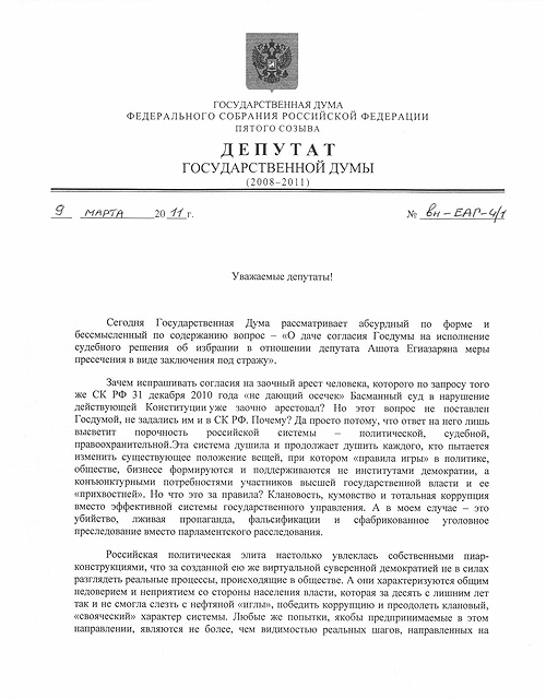 Обращение Ашота Егиазаряна к депутатам Госдумы