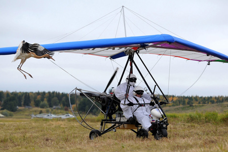 Владимир Путин по пути на саммит АТЭС во Владивосток принял участие в эксперименте, проводимом российскими орнитологами в рамках проекта «Полет надежды» по спасению редкого вида журавлей — стерхов, сообщает пресс-служба Кремля. В рамках проекта президент России, находясь за штурвалом мотодельтаплана, совершил полет с птицами, указав им маршрут перелета на зимовку.
