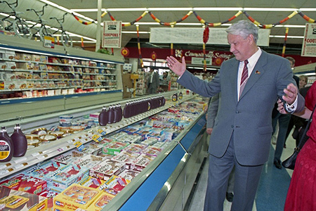 абавные фото из архива газеты Хьюстон Кроникл. 16 сентября 1989 года. Народный депутат и член Верховного совета СССР Борис Николаевич Ельцин прибыл с первым и неофициальным визитом в США. В программе было посещение Космического центра имени Линдона Джонсона в штате Техас. После знакомства с американскими космическими технологиями он решил приобщится к технологиям торговым и впервые в жизни зашел в обычный американский супермаркет.