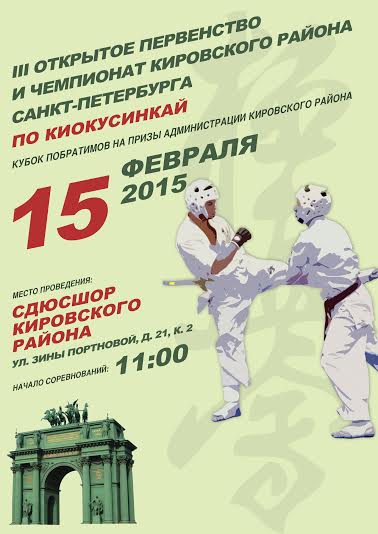 15 февраля 2015 года Ассоциация Киокусинкай Санкт-Петербурга при поддержке СПб ГУ «ЦФКиС «Нарвская застава» и администрации Кировского района Санкт-Петербурга проводит III Открытое Первенство и Чемпионат Кировского района Санкт-Петербурга по киокусинкай «Кубок побратимов на призы администрации Кировского района» на базе СДЮСШОР Кировского района.