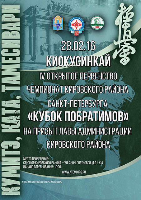 28 февраля 2016 года Ассоциация Киокусинкай Санкт-Петербурга совместно с СПб ГУ «ЦФКиС «Нарвская застава» и администрацией Кировского района Санкт-Петербурга при поддержке Комитета по физической культуре и спорту Санкт-Петербурга проводит IV Открытое первенство и открытый чемпионат Кировского района Санкт-Петербурга по киокусинкай «Кубок побратимов" на призы Главы администрации Кировского района на базе СДЮСШОР Кировского района. Информационная поддержка -