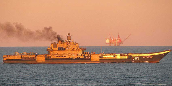 На сайте Dagbladet появилась первая фотография "Адмирала Кузнецова" с норвежской нефтяной платформой Gullfaks на фоне. Норвежцы пока не предпринимают никаких особых действий, но явно обескуражены такой неожиданной демонстрацией силы корабельной авиацией крейсера в зоне норвежской нефтедобычи.