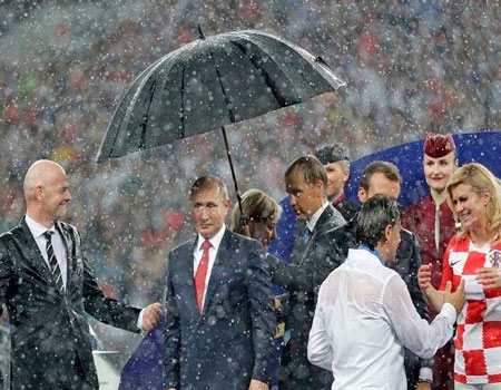 Церемония награждения после финала ЧМ-2018 запомнилась всем одной интересной деталью. В Москве, как и десять лет назад во время решающего матча Лиги чемпионов-2007/08 между "Челси" и "МЮ", начался сильный ливень, и, когда командам стали вручать медали, над Владимиром Путиным сразу раскрыли зонт. Вскоре от дождя были защищены и остальные члены парадной делегации, но пользователи соцсетей обратили внимание именно на зонт российского Президента. Как пишет The Sun, зонтом был укрыт только российский президент Владимир Путин. При этом лидеры Франции и Хорватии Эммануэль Макрон и Колинда Грабар-Китарович стояли под дождем. Телеканал РЕН ТВ обращает внимание на то, что на самом деле под зонтом вместе с Путиным были президент ФИФА Джанни Инфантино и частично — Макрон. Президент Франции при этом практически не обращал внимания на дождь из-за сильной радости за сборную своей страны. Чуть позже зонты принесли для всех лидеров. А на следующих кадрах видно, что Путин намок ничуть не меньше, чем его коллеги. ![]() Конфуз стал поводом для обсуждений и в Сети. Пользователи посчитали, что Путин не смог проявить достаточного уважения к высокопоставленным гостям. В частности, ряд критиков считает, что российский президент должен был проявить знак внимания к единственной женщине на церемонии — президенту Хорватии Колинде Грабар-Китарович: «Позор России, женщина промокла», «Путину не пришло в голову передать зонт единственной женщине», «Надо было женщине отдать!». Другие пользователи заступились за российского президента: «У каждого из глав есть обслуживающий персонал. У нашего главы государства отреагировали моментально. Молодцы», «Если бы передал — опять бы орали про сексизм. Определитесь уже!». Во время церемонии награждения чествовали новых чемпионов мира по футболу — сборную Франции. В финальном матче мирового первенства французам противостояли хорваты, которые уступили со счетом 4:2. Голами у победителей отличились Антуан Гризманн, Поль Погба и Килиан Мбаппе. Позже лидеры России, Хорватии, Франции и президент ФИФА попали под другой дождь — из шампанского. Празднующие победу на чемпионате мира французы так радовались победе, что случайно забрызгали игристым вином президентов.
