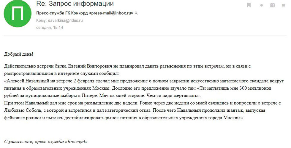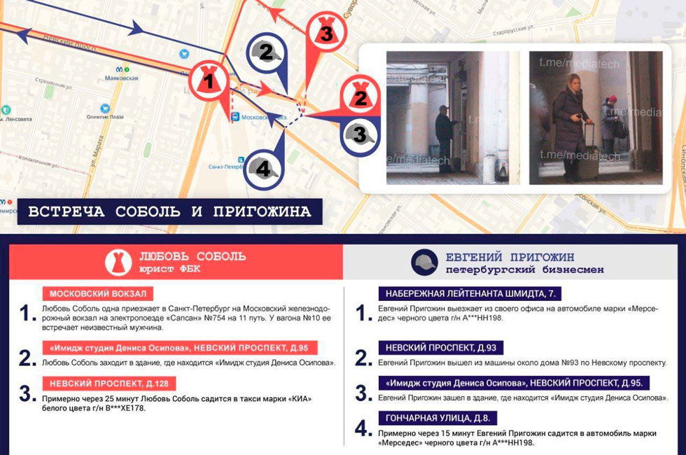 Встреча между юристом так называемого Фонда борьбы с коррупцией Любови Соболь и петербургским предпринимателем Евгением Пригожиным все-таки состоялась. Подтверждением тому служат фотографии, опубликованные в социальный сетях, а также рассказ стрингера, который снял приезд девушки. Начнем с того, что первое сообщение о встрече Пригожина с юристом ФБК появилось 18 февраля. Тогда, Telegram-канал «Медиатехнолог» опубликовал два снимка, на которых Соболь и Пригожин были запечатлены во дворе дома номер 95 по Невскому проспекту, где расположен салон красоты «Имидж-студия Дениса Осипова». В пресс-службе компании «Конкорд», принадлежащей Евгению Пригожину, ответили на запрос агентства «Ридус», подтвердив факт встречи не только с юристом ФБК, но и с его руководителем Алексеем Навальным. Блогер потребовал у петербургского предпринимателя 300 миллионов рублей, чтобы остановить искусственно созданное информационное давление, связанное со скандалом вокруг питания в школах Москвы. Навальный дал две недели на раздумья, после чего в Северную столицу и приехала Соболь. ![]() Примечательно, что ни сам факт встречи, ни то, что на фотографиях запечатлена именно она, юрист ФБК отрицать не стала. ![]() Доказательством требований главы ФБК служит опубликованное ранее «расследование». В Сети видео появилось сразу после визита Соболь в Северную столицу. Отметим, что само расследование было подготовлено крайне плохо. Пользователи соцсетей сразу же обратили свое внимание на фотографию «умытаза», в котором якобы мылись фрукты и овощи. Выяснилось, что фото является интернет-мемом трехлетней давности, который не имеет никакого отношения к «Конкорду». ![]() После бурной реакции пользователей Сети, а также ряда СМИ, написавших о фейке, ролик был «перезалит», и из него исчезла та самая фотография «умытаза». Сам Навальный принес извинения подписчикам за допущенную ошибку. ![]() Расследования ФБК в принципе не демонстрируют качественную работу. Примечательно, что за всё это время Алексей Навальный ни разу не отрицал факт встречи с петербургским бизнесменом. Другой Telegram-канал SIL0VIKI опубликовал фотографии, на которых видно подробные маршруты перемещений Навального, Соболь и Евгения Пригожина. ![]() ![]() Информация, которой он поделился с редакцией канала, оказалась крайне интересной. В день своего визита Любовь Соболь приехала в Санкт-Петербург одна на 11 путь Московского вокзала на «Сапсане» №754, где у вагона № 10 ее встретил неизвестный мужчина». Подлинность опубликованной «добрым стрингером» информации подтвердил источник в петербургском штабе Навального. Он рассказал, что соболь строжайше запретила встречать ее на вокзале. «Добрый стрингер» попросил не раскрывать его имя. Он рассказал, что вел наблюдение за Любовью Соболь с момента ее приезда в Северную столицу и видел, как на вокзале ее встречал неизвестный мужчина, который сопровождал ее до салона красоты на Невском. Спустя 30 минут ему удалось заметить и Евгения Пригожина. Стрингер отметил, что Пригожин был один, а не как обычно в сопровождении охраны. «Было похоже, что все тщательно спланировано. Пригожин зашел с одной стороны и вышел потом с другой. Понять, что это он было очень трудно», - добавил собеседник. ![]() ![]() После этого они с товарищем продолжили следить за двумя объектами. Сразу же после встречи Евгени