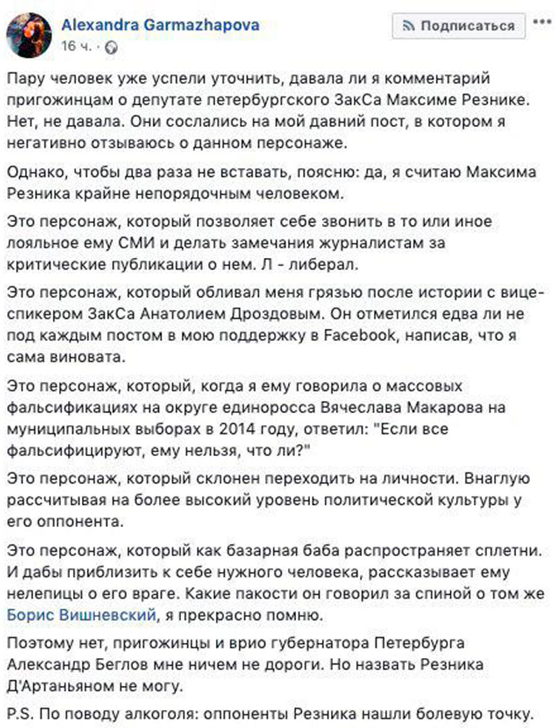 Репутация скандального депутата ЗакСа Санкт-Петербурга Максима Резника окончательно оказалась испорченной, как он оказался замешан в истории с наркотиками, а также был уличен в домашнем насилии над собственной женой под влиянием алкоголя. Оттолкнули от него людей и вскрывшиеся факты участия в коррупционном деле с вымогательством у застройщиков. Причем критике скандального парламентария подвергают уже и те, кто вроде бы должен быть на его стороне. Оппозиционная журналистка Александра Гармажапова выложила на своей страничке в Facebook пост, где рассказала об отношении Резника к фальсификациям в ходе выборов 2014 года и к давлению на СМИ. ![]() По словам журналистки, она не раз была свидетельницей хамского поведения Резника. «Я считаю Максима Резника непорядочным человеком, который позволял себе звонить в то или иное лояльное СМИ и делать замечания журналистам за критические публикации о нем. Этот персонаж склонен переходить на личности, внаглую рассчитывая на более высокий политический уровень культуры у его оппонента», – пишет она. Отметила Гармажапова и то, что ради «набивания политических очков» Резник готов поливать грязью даже своих сторонников: «Подобно базарной бабе он распространяет сплетни. И дабы приблизить к себе нужного человека, рассказывает ему нелепицы о его враге. Какие пакости он говорил за спиной о том же Борисе Вишневском, я прекрасно помню». О лицемерии парламентария, уличенного в употреблении марихуаны, говорит его отношение к выборам. Ратующий на публике за «чистоту выборов» Резник в частной беседе с журналисткой показал себя законченным лицемером. «Это персонаж, который, когда я ему говорила о массовых фальсификациях на округе единоросса Вячеслава Макарова на муниципальных выборах в 2014 году, ответил: «Если все фальсифицируют, ему нельзя, что ли?». Напомним, что именно за поддержку фальсификаций на выборах он был исключен из партии «Яблоко». Своим поведением Резник, одной из «болевых точек» которого журналистка назвала его пристрастие к алкоголю, подорвал к себе доверие даже отъявленных сторонников несистемной оппозиции. Так, депутат Вишневский, который был с Резником в партии «Яблоко», осудил его за отказ от сдачи теста на наркотики. А коллеги по ЗакСу однозначно заявили, что оскандалившийся депутата должен быть лишен мандата.