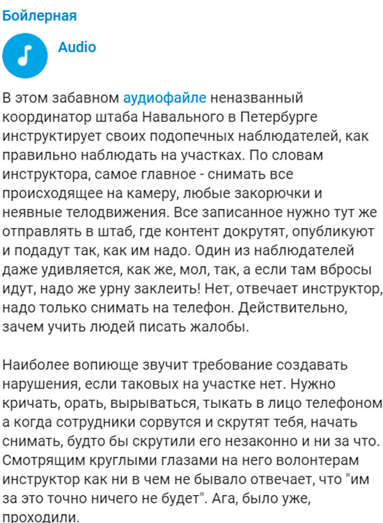 Telegram-канал «Футляр от виолончели» обнародовал аудиозапись, на которой неизвестные кураторы якобы инструктировали членов избирательных комиссий. Работа будто бы велась в пользу одного из кандидатов. Запись при этом низкого качества и, вероятнее всего, фейковая, а значит, вполне может пополнить копилку сегодняшних провокаций. «Инструктор» на записи объясняет, как нужно подтасовывать результаты выборов: давать взятки голосующим, менять отметки в бюллетенях в пользу «нужного» кандидата, использовать чужие голоса. Автор Telegram-канала утверждает, что по всей России осуществляются массовые вбросы за провластных кандидатов. ![]() Однако всем известно, что на избирательных участках присутствуют наблюдатели, в том числе от независимых организаций, которые следят, чтобы никаких вбросов не было, а правила голосования полностью соблюдались. Подозрительные случаи рассматриваются сразу, так что в законности выборов сомневаться не приходится. Ранее Telegram-канал «Бойлерная» сообщил подписчикам о том, что со стороны штаба Навального готовятся провокации, и в доказательство выложил аудиозапись инструктажа наблюдателей. Волонтерам рассказывают, что при малейшем подозрении в нарушениях они должны фиксировать все на камеру телефона и отправлять материалы в штаб. При этом наблюдателям не советуют пресекать нарушения законным путем, то есть заклеивать урны и писать жалобы. Нужно всего лишь отправить видео в штаб - вот что требуется от наблюдателей Навального. ![]() Инструктор даже рекомендует провоцировать работников избирательной комиссии, создавать как можно больше шума, уверяя, что последствий не будет. Что это, если не попытка воспрепятствовать законным выборам? Очевидно, что и фейковый, и реальный инструктаж являются составляющими одного большого целого. Оппозиционеры стараются сделать все, чтобы Единый день голосования выглядел нелегитимным, и для этого не брезгуют откровенными подделками. Такая же ситуация была и с президентскими выборами 2018 года, однако тогда, несмотря на все усилия несистемщиков, российские и международные наблюдатели признали их чистыми.