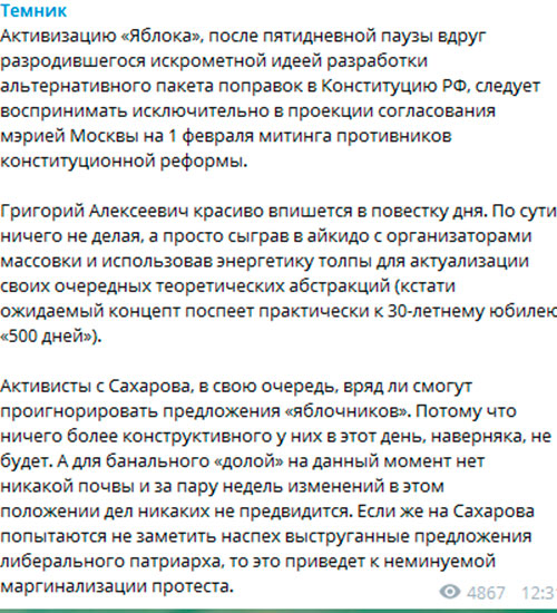 Депутат петербургского ЗакС Борис Вишневский сегодня высказался по поводу перспектив изменений в Конституции России, которые анонсировал президент Владимир Путин. Он выступил от имени своей партии «Яблоко», которая заявила, что предложит собственный вариант поправок и будет добиваться их рассмотрения. Вчера об этом же сказал председатель партии Николай Рыбаков. Депутат рассказал, что предложение «Яблока» внести свои поправки в документ сразу встретили скептично – часть «ноет», что это означает согласие с повесткой Кремля, а часть – что все равно ничего не получится, и поправки демократов проигнорируют. Но Вишневский считает, что «сидеть дома» и ничего не делать в такой ситуации – недальновидно, и задача партии – заставить власть пойти на поводу у общества, изменив в Конституции то, что реально давно пора изменить, а не то, что только поможет дальнейшим централизации. «Мы знаем, что менять: неужели вы думаете, друзья, что за 25 лет действия Конституции в «Яблоке» не думали о ее недостатках и не готовили предложения по ее изменению? Думали и готовили. Есть что сейчас вынести на обсуждение экспертов. Да и уж многих экспертов тоже, без сомнения, давно готовы предложения. Мы будем действовать – а не оглядываться на тех, кто и сам ничего не хочет делать, и ничего другого не может предложить», - написал он. Это нельзя расценить иначе, как выпад в сторону Алексея Навального, который демонстративно отстранился от темы, назвав ельцинскую конституцию «омерзительной» и не заявил о намерениях что-то делать в ее защиту или поддерживать тех, кто выдвигает альтернативу. В Telegram заметили активность «Яблока» и назвали ее примером «политического айкидо». Предложение партии выглядит логичным, особенно в свете поданной заявки на акцию противников конституционной реформы 1 февраля. Но при этом но не означает, что лидерам "Яблока" надо будет действовать решительно. Предложенные альтернативные поправки позволят подзабытой партии красиво вписаться в повестку. ![]() Таким образом, «Яблоко» пусть и не напрямую, но примыкают к мнению Михаила Ходорковского, который сразу отметил, что Конституция 1993 года при всех недостатках декларировала права и свободы, и все предполагаемые изменения необходимо будет тщательно отслеживать и курировать, и предложил потребовать созыва Конституционного собрания или создать его подобие в Сети, с привлечением экспертного сообщества. Вероятно, теперь олигарх, явно разочарованный в команде Навального, возобновит или усилит поддержку партии, доверив Вишневскому и Рыбакову организовывать и раскачивать протестную активность в Москве и Петербурге. Если «Яблоко» справится с этим, олигарх может помочь кандидатам партии пробиться и в Госдуму следующего созыва, на что они рассчитывают. Тем более, что Вишневский и Ходорковский несколько лет назад в Таллине встречались лично, и не исключено, что поддерживают контакт.