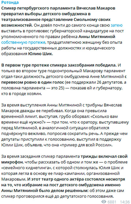Журналистки Мария Карпенко и Ксения Клочкова выставили политический провал главы спикера ЗакСа Вячеслава Макарова по выдвижению Юлии Шик на пост детского омбудсмена Петербурга как победу и демонстрацию силы Смольному. Соответствующая запись размещена в Telegram-канале «Ротонда». Вопрос исполнения журналистками политзаказов спикера в очередной раз «повис в воздухе». Провал Макарова в ЗакСе На заседании Заксобрания Санкт-Петербурга 26 февраля был окончательно решен вопрос замены Светланы Агапитовой – регионального уполномоченного по правам ребенка, чьей срок полномочий подошел к концу. В рамках двухуровневых парламентских выборов, депутаты избрали новым детским омбудсменом Анну Митянину - юриста и заместителя губернатора Александра Беглова по социальным вопросам. После оглашения результатов тайного голосования Митянина принесла присягу: «Клянусь защищать права и законные интересы ребенка, добросовестно исполнять свои обязанности, руководствуясь конвенцией по правам ребёнка, конституцией РФ, федеральным законодательством и законодательством Санкт-Петербурга. Справедливостью и голосом совести», - произнес новый детский омбудсмен. Присяга Митяниной закрыла важную веху в истории Петербурга, связанную с наличием конфликта между парламентом и правительством города. Так, на выборах детского омбудсмена спикер ЗакСа Вячеслав Макаров пытался продвинуть свою протеже Юлию Шик на пост уполномоченного по правам ребенка. «Макаровский кандидат» появился неспроста. Ранее спикер устроил женщину на работу в парламент, а также оказывал ей политическую и административную поддержку в сомнительном деле отъема детей у бывшего мужа Андрея Зайцева. В преддверии самих выборов оказывал давление на внутренние структуры парламента, мешая Митяниной (претендент, предложенный Бегловым) зарегистрироваться в качестве кандидата. По мнению журналистов, фигура Шик продвигалась только для одной цели – уязвить Беглова. На самом заседании глава Заксобрания перебивал Митянину, агрессивно себя вел по отношению к ней, зато Шик называл «мужественной женщиной, с которой нужно брать пример». Однако затея Макарова, несмотря на все потуги, не выгорела, так как депутаты отказались поддержать некомпетентного кандидата без юридического образования с неоднозначной репутацией. «Ротонда» показала, кому Макаров приходится хозяином Очевидный провал спикера ЗакСа Мария Карпенко и Ксения Клочкова осветили иначе. В Telegram-канале «Ротонда» журналистки выставили поражение Макарова за победу, обыграв факт выхода Митяниной и Шик во второй тур выборов. Не исключено, что авторы канала отрабатывали оплаченный политический заказ. «Спикер петербургского парламента Вячеслав Макаров превратил выборы детского омбудсмена в театрализованное представление Смольному своих возможностей <…> В первом туре протеже спикера Заксобрания победила. И только во втором туре подконтрольный Макарову парламент отдал-таки должность детского омбудсмена Анне Митяниной с перевесом ровно в один голос (ее поддержали 26 депутатов, а половина парламента — это 25)», - написали авторы канала. По мнению Карпенко и Клочковой, таким образом Макаров показал Беглову, кто в «городе хозяин». ![]() К версии о том, что пост «Ротонды» является политическим заказом, наводят несколько нюансов. Во-первы