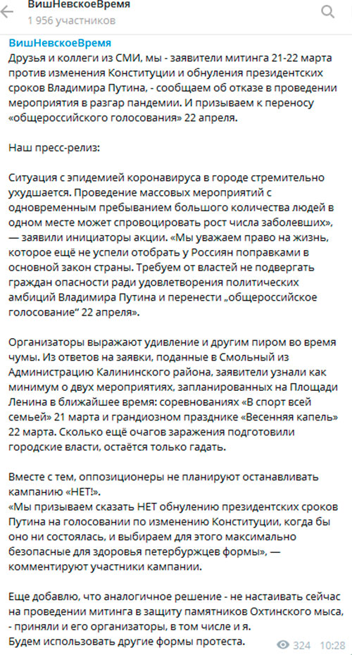 Депутат ЗакСа Борис Вишневский продолжает «паразитировать» на теме распространения коронавируса. Провальные акции протеста заставили парламентария «переобуться в воздухе» - политик решил прекратить призывать граждан к участию в митингах, и начал требовать переноса даты общероссийского голосования. Международная ситуация с распространением пандемии коронавируса продолжает стремительно ухудшаться. По данным на 17 марта известно о более чем 182 тысячах зараженных и около семи тысячах погибших. Все больше стран вводят «карантинные меры» с ограничением передвижений граждан, запретом на массовые сборы людей и закрытием торгово-развлекательных точек. Коронавирусная «лихорадка» сказалась и на политических настроениях в России. Депутат Заксобрания Санкт-Петербурга Борис Вишневский в своем телеграм-канале опубликовал пост, в котором призывает перенести, в связи с распространением коронавируса, общероссийское голосование, назначенное на 22 апреля. ![]() Парламентарий пишет, что в близких к ЧС условиях проведение референдума спровоцирует рост числа заболевших. Хотя пару дней назад у Вишневского была диаметрально противоположная позиция. ![]() В своем посте от 13 марта депутат писал, что власти города запретами массовых мероприятий численностью более тысячи человек якобы демонстрируют страх. Вероятно, политик имел ввиду, что митинг численностью в 999 человек в многомилионном городе сможет негативно сказаться на процессе принятия поправок в Конституцию в связи с чем Смольный «ставит подножки» оппозиции. Однако старания Бориса Лазаревича раскачать народ для участия в митингах прошли в пустую. Пользователи соцсетей раскритиковали желание депутата рисковать чужими жизнями ради собственных политических интересов. ![]() Кроме этого, еще до вступления в силу запрета массовых мероприятий, оппозиция организовала серию провальных протестных акций, которые не вызвали отклика у горожан. ![]() Несколько пикетирующих в разные дни выходили на Невский проспект, Малую Садовую улицу и Сенатскую площадь. Сначала активисты мирно фотографировались с плакатами, потом, не получив нужной поддержки, начали провоцировать представителей правоохранительных органов, что привело 15 марта к задержанию около 20 человек. В отделениях на пикетчиков составили протоколы и отпустили «с миром». Вишневский чутко уловил настроение населения. Отсутствие поддержки на акциях протеста и соцсетях заставили парламентария «переобуться в воздухе». Буквально за пару дней депутат резко изменил свою позицию, вспомнив, что в условиях эпидемиологической опасности людям стоит соблюдать максимальные меры предосторожности. Он даже составил обращение в Роспотребнадзор, в котором потребовал ввести запрет на прикладывание к мощам святых в церквях. Сейчас депутат продолжает паразитировать на теме с пандемией. Однако речи о «заботе о благополучии населения» нет – парламентария заботят только собственный имидж и политические маневры, выгодные для продвижения оппозиционной повестки. Не получив нужной поддержки во время протестных акций, он решил использовать тему с распространением коронавируса для попытки срыва всенародного голосование, которое предварительно состоится только 22 апреля. За месяц ситуация может изменится, и, вполне вероятно, что правительство действит