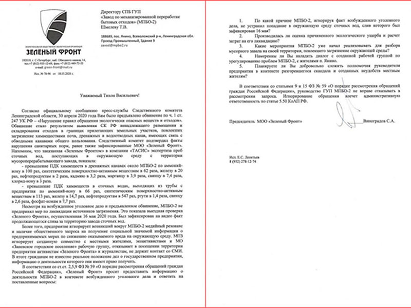 Арбитражный суд Санкт-Петербурга и ЛО вынес вердикт по уголовному делу против главы мусороперерабатывающего завода «МПБО-2» в Янино-1 Тихона Шмелёва. Предприятие оштрафовано на 100 000 рублей за неисполнение лицензионных требований в работе. «МПБО-2» доставляет немало проблем жителям поселка. На губительные последствия деятельности завода указывали экологи и волонтеры организации «Зелёный фронт», ситуация освещалась в СМИ. Активисты «Зеленого фронта» выяснили, что неприятный запах, распространяющийся над поселком, исходит именно с территории «МПБО-2». Предположительно там свалены тонны разлагающегося мусора, что идет вразрез с требованиями регламента, в соответствии с которым отходы не могут оставаться на хранении завода более 24 часов – за сутки они обязаны быть переработаны. Также стало известно, что сточные воды из «МПБО-2» сливаются в сточные канавы общего пользования, а это недопустимо по санитарным нормам. «Зеленый фронт» представил доказательства вывоза мусора с территории свалки «МПБО-2» в Петербург вместо утилизации. В частности, один из грузовиков с отходами из Янино проследовал на складскую территорию предприятия «ЛСР.Базовые», где и разгрузился. Журналистам удалось пообщаться с председателем «Зелёного фронта» и задать вопрос о ситуации с «МПБО-2». Сергей Виноградов рассказал, что на текущий момент делают активисты, чтобы остановить загрязнение Ленобласти и Петербурга. По его словам, ситуация на особом контроле – от имени организации направлен запрос на имя Тихона Шмелёва с просьбой отчитаться о планируемых мерах по устранению нарушений, выявленных Следственным комитетом. ![]() Согласно российскому законодательству, руководство «МПБО-2» не имеет правовой возможности оставить данный запрос без ответа.