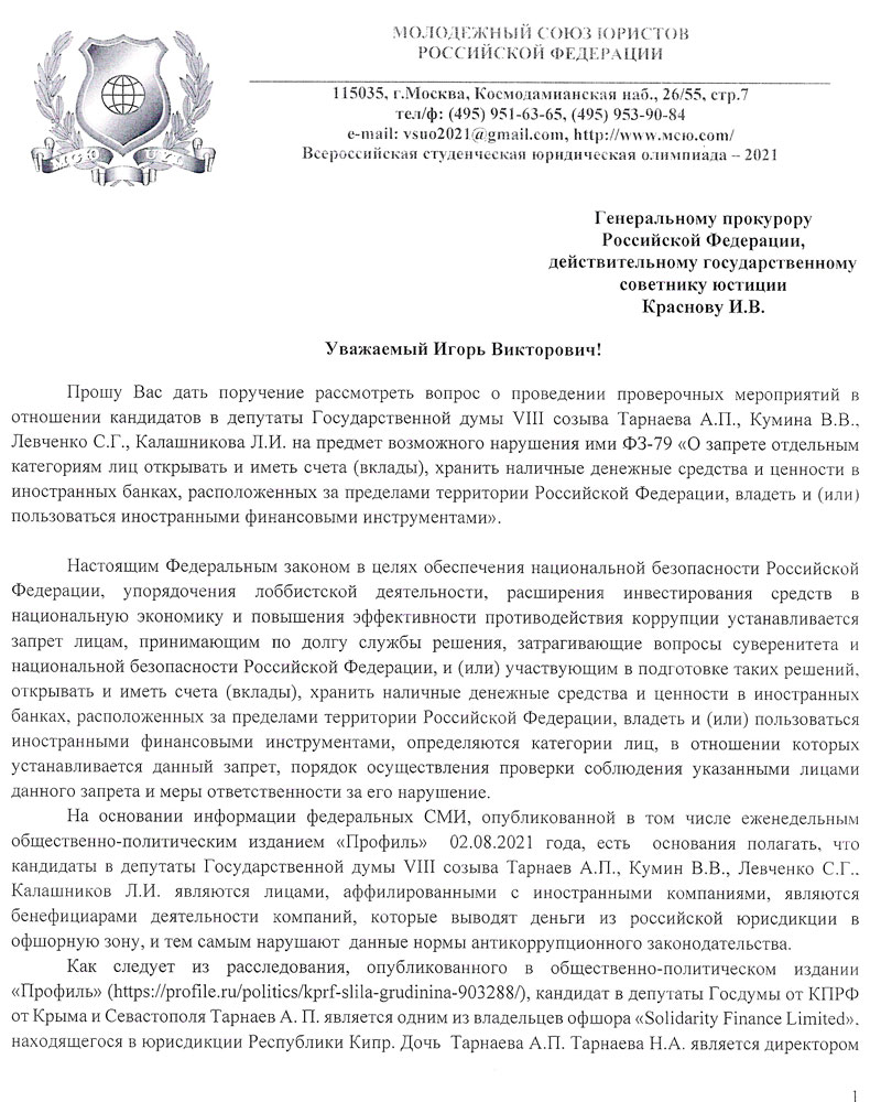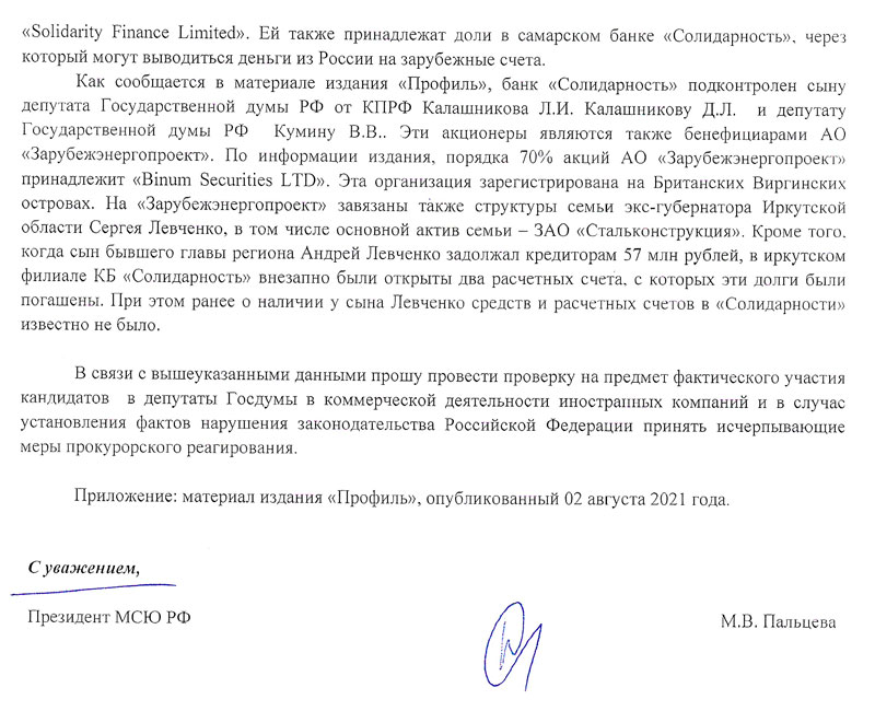 Президент Молодежного союза юристов Маргарита Пальцева направила на имя Генпрокурора РФ Игоря Краснова обращение с просьбой провести проверку на предмет фактического участия сразу четырех кандидатов в депутаты Госдумы от КПРФ в коммерческой деятельности иностранных компаний. Документ подготовлен на основании опубликованной в издании "Профиль" 2 августа 2021 года информации о том, что кандидаты в депутаты Госдумы от КПРФ Александр Тарнаев, Вадим Кумин, Сергей Левченко и Леонид Калашников являются лицами, аффилированными с иностранными компаниями. Они также "являются бенефициарами деятельности компаний, которые выводят деньги из российской юрисдикции в офшорную зону, и тем самым нарушают данные нормы антикоррупционного законодательства", указано в обращении. Согласно расследованию "Профиля", со ссылкой на публикацию издания "Век", Тарнаев контролирует офшор "Solidarity Finance Limited", находящийся в юрисдикции республики Кипр, через свою дочь Надежду Тарнаеву. Ей принадлежат доли в самарском банке "Солидарность", через который, как предполагают СМИ, могут выводиться деньги из России на зарубежные счета. Чиновники от КПРФ также являются бенефициарами АО "Зарубежэнергопроект", порядка 70% акций которой принадлежит офшору "Binum Securities LTD", пишет СМИ. "В случае установления фактов нарушения законодательства… принять исчерпывающие меры прокурорского реагирования", — говорится в обращении, текст которого имеется в распоряжении Ленправды. ![]() ![]() "Генпрокуратура должна отреагировать на наш запрос, но надежды на то, что проверку успеют завершить до выборов, немного. Все зависит от того, насколько госструктура будет заинтересована в проведении расследования и сможет ли она получить информацию по поводу упомянутых в открытых источниках иностранных организаций", — прокомментировала ситуацию Пальцева. По ее словам, если факты, упомянутые в СМИ, подтвердятся, попадание в списки депутатов, нарушивших законодательство, грозит серьезными последствиями. "Возникнут вопросы не только к государственной проверке документов, но и к самим кандидатам — вплоть до уголовной ответственности, если выяснится, что они скрыли факты наличия бизнеса за рубежом", — сказала она.