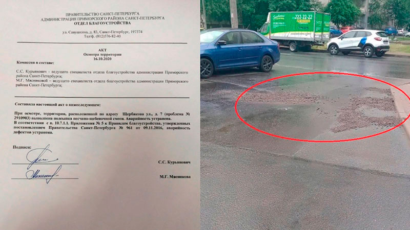 Жители Приморского района Петербурга назвали фейком фотоочет администрации о ремонте ямы на улице Щербакова