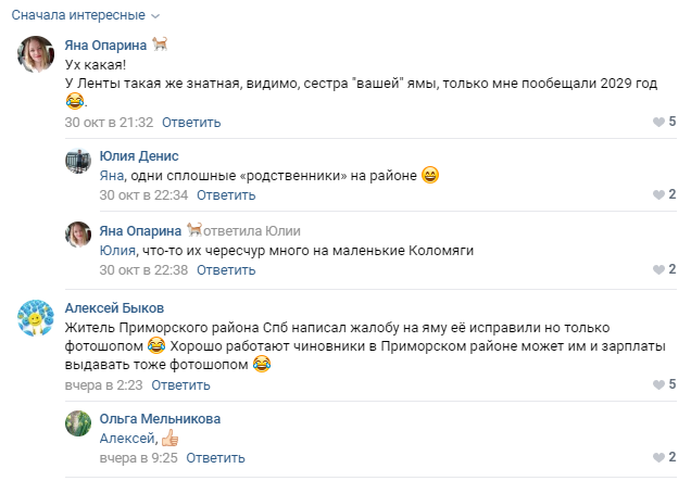 Жители Приморского района указали на неэффективность работы местной администрации. На примере крупной ямы при въезде к магазину «Перекресток» на улице Щербакова петербуржцы пояснили, что власти не заинтересованы в решении проблемы. Ранее на странице сообщества «ВКонтакте» «Любимые Коломяги» разметили пост, в котором пользователь пожаловался на крупную яму при въезде к магазину «Перекресток» на улице Щербакова. В связи с этим на портале «Наш Санкт-Петербург», предназначенном для оперативного взаимодействия жителей города с представителями органов власти (в том числе администраций районов), была опубликована жалоба с просьбой устранить опасный участок. ![]() Спустя время от администрации Приморского района пришел ответ, что ремонт проведут в 2025-м году, а сама аварийность якобы была устранена — яму засыпали песчано-щебеночной смесью. Соответствующие «фотодоказательства» были приложены к документу с ответом властей на жалобу. ![]() По словам пользователей, данный отчет оказался фейком — участок никто засыпать не стал, а щебень, который можно заметить на фото, просто пририсовали в фотошопе. Подобный подход к жалобам жителей Приморского характеризует власти административно-территориальной единицы Петербурга не с лучшей стороны. В комментариях к публикации пользователи в ироничной форме предлагают местным чиновникам выплачивать зарплату через «фотошоп». ![]() Недалекий подход к вопросу вызывает у горожан лишь негативную реакцию. Люди заинтересованы в решении образовавшейся проблемы, и фейковые отчеты со стороны властей — явный показатель равнодушного отношения к интересам населения.