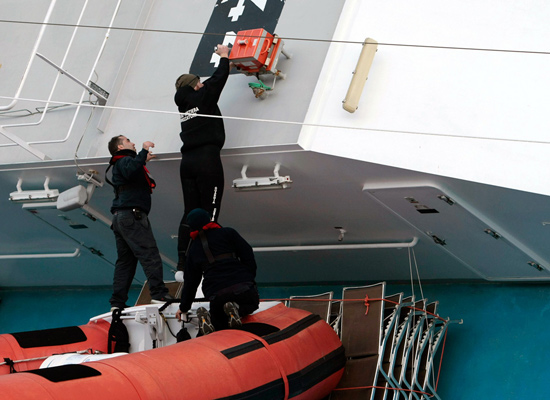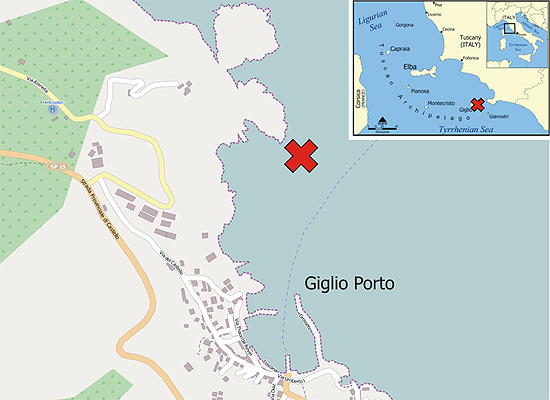 Сотрудники итальянской береговой охраны снимают «черный ящик» с борта затонувшего круизного лайнера «Коста Конкордия».