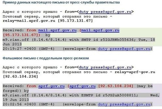 России, разослали письмо по информационным агентствам. Анализ заголовков письма, проведенный экспертами Digit.ru, показал, что истинным отправителем подделки был домен aprf-gov.ru. Он отличается от настоящего всего на 1 символ — вместо дефиса у настоящего домена пресс-службы правительства стоит точка — aprf.gov.ru. Домен aprf-gov.ru был зарегистрирован 16 июня 2013 года через регистратора доменов R01.